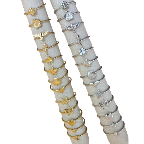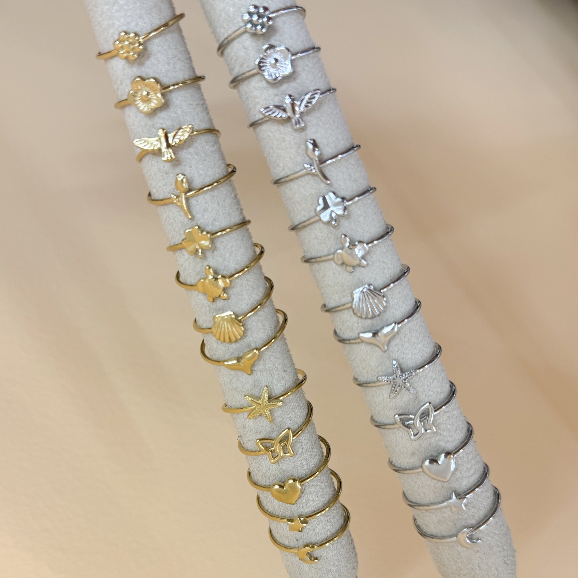 Anel Fino Aço 6,00 € Desconto de %. Partilhar Modelo Flor Bolinhas Flor Espírito Santo Tulipa Trevo Tartaruga Concha Barbatana Estrela do Mar Borboleta Coração Estrela Lua Cor Dourado Prateado Comprar Contactar Material: aço inoxidável Tamanho regulável