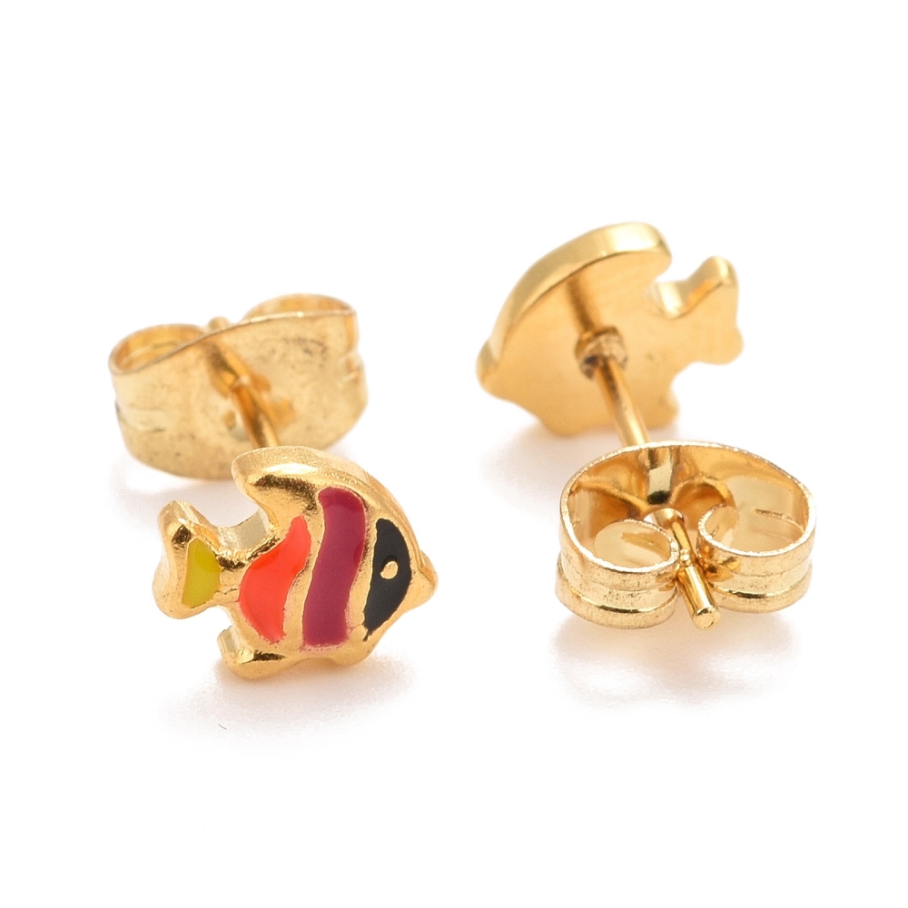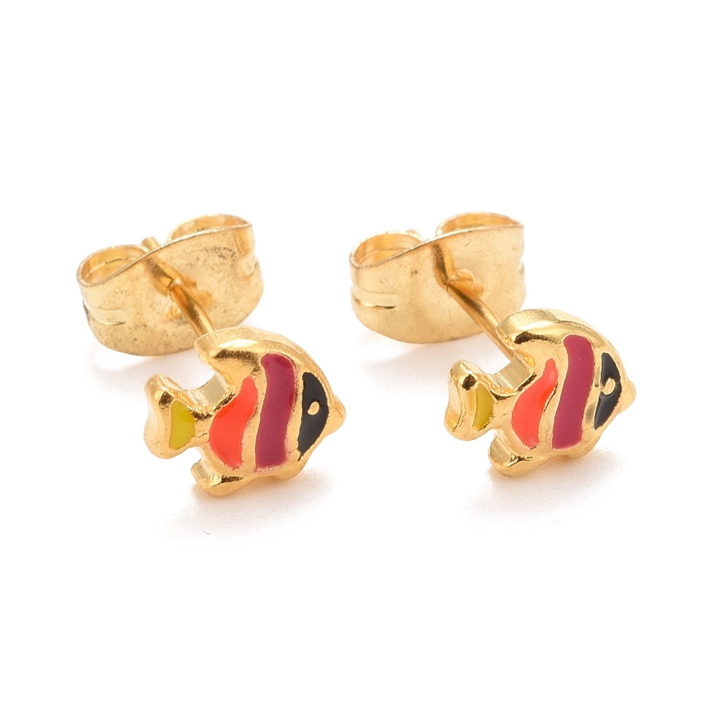 Brincos Peixinhos 6,00 € Desconto de %. Partilhar Tons Laranja Roxo Comprar Contactar Material: aço inoxidável e esmalte Dimensão: 6mm x 7mm