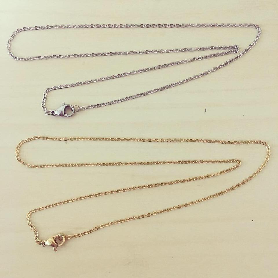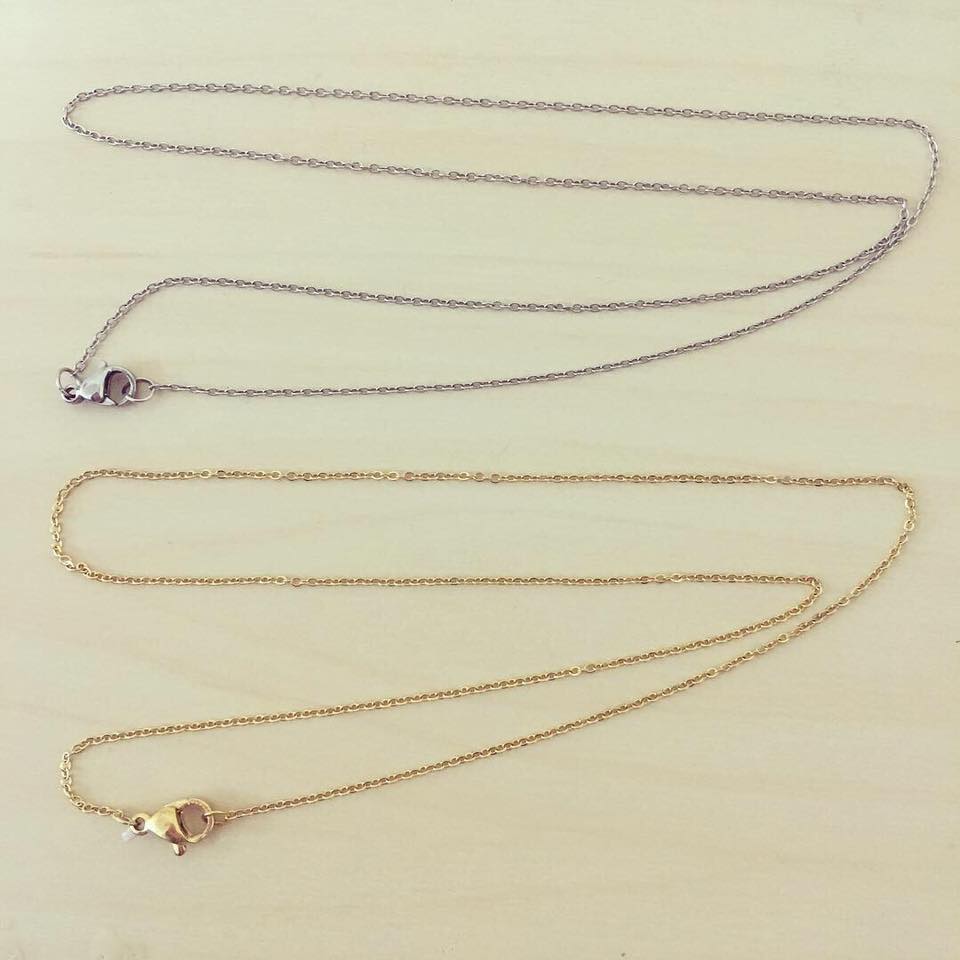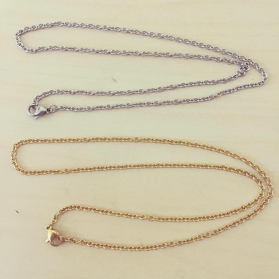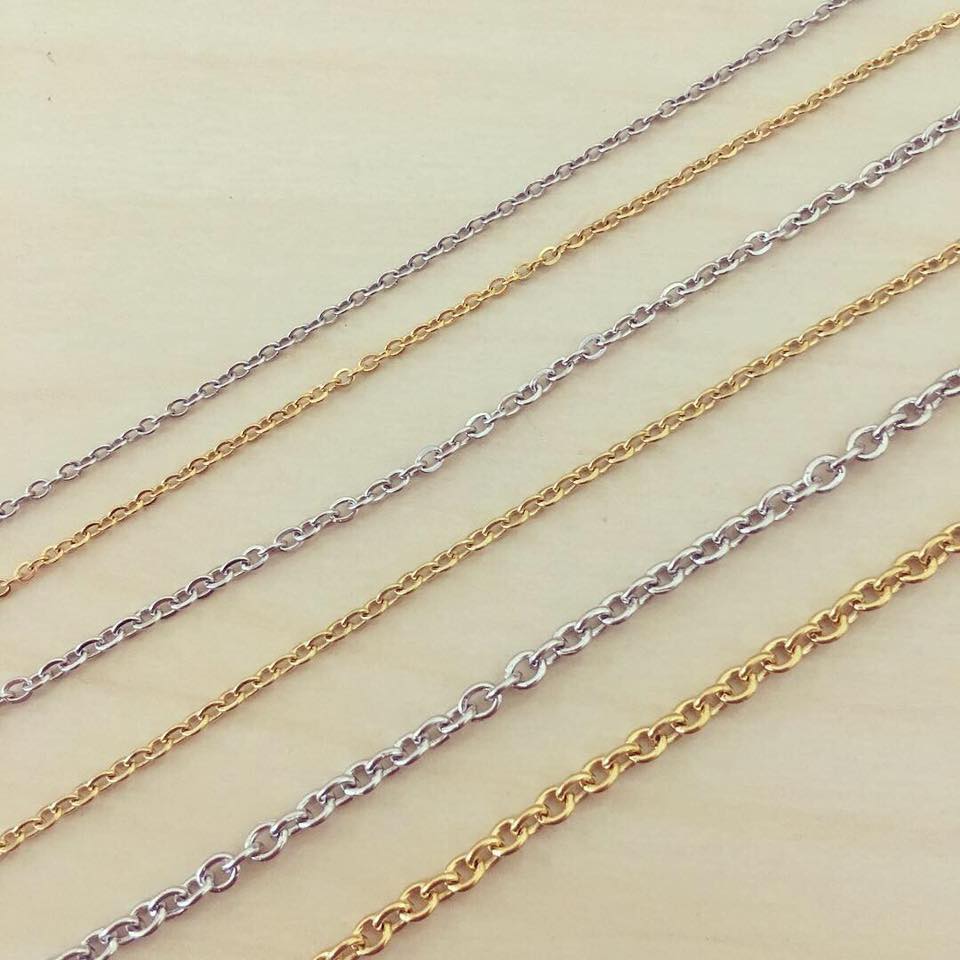 Colar Aço Elos Ovais 2,00 € Desconto de %. Partilhar Cor Prateado Dourado Espessura 1mm 1.5mm 2mm Comprar Contactar Material: aço inoxidável Dimensão: - comprimento de 45cm. - espessuras de 1mm, 1.5mm e 2mm.
