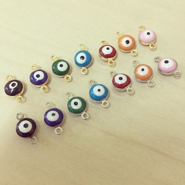 Entremeio Colorido Olho da Sorte 0,60 € Desconto de %. Partilhar Cor Azul Escuro Preto Azul Claro Verde Laranja Rosa Vermelho Contorno Dourado Prateado Comprar Contactar Material: metal e esmalte Dimensões: 11mm x 6mm
