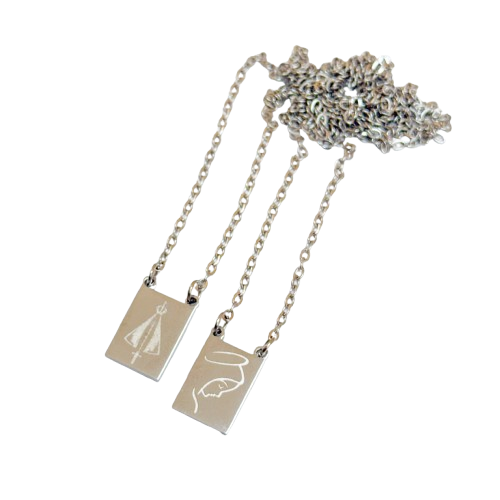 • Colar com duas placas retangulares metálicas prateadas com desenhos