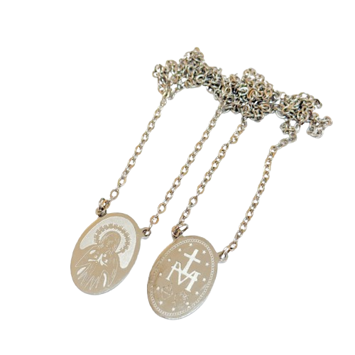 • Colar prateado com pendente oval com figura religiosa e cruz com letras AM