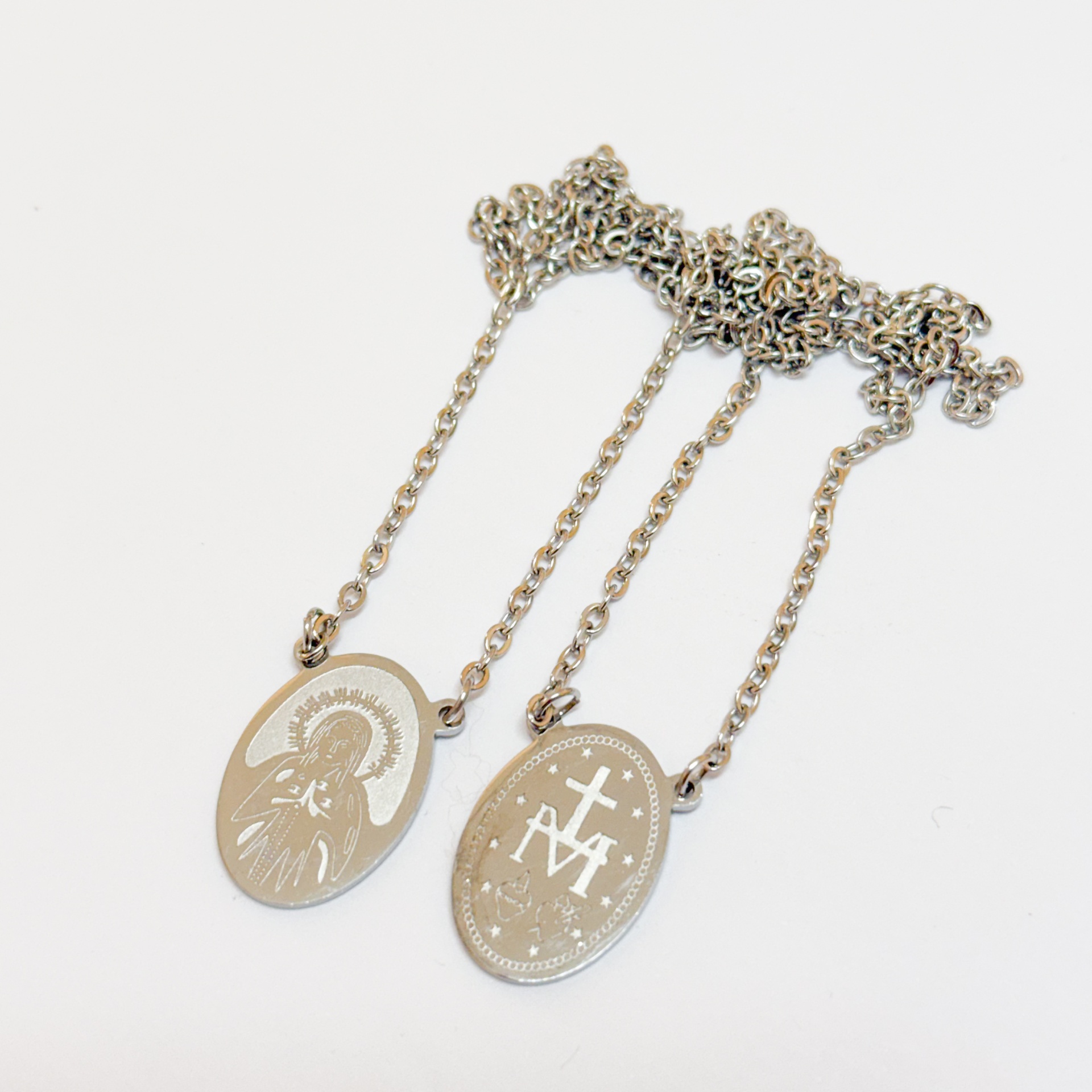 • Colares com pendentes ovais metálicos e símbolos religiosos gravados.