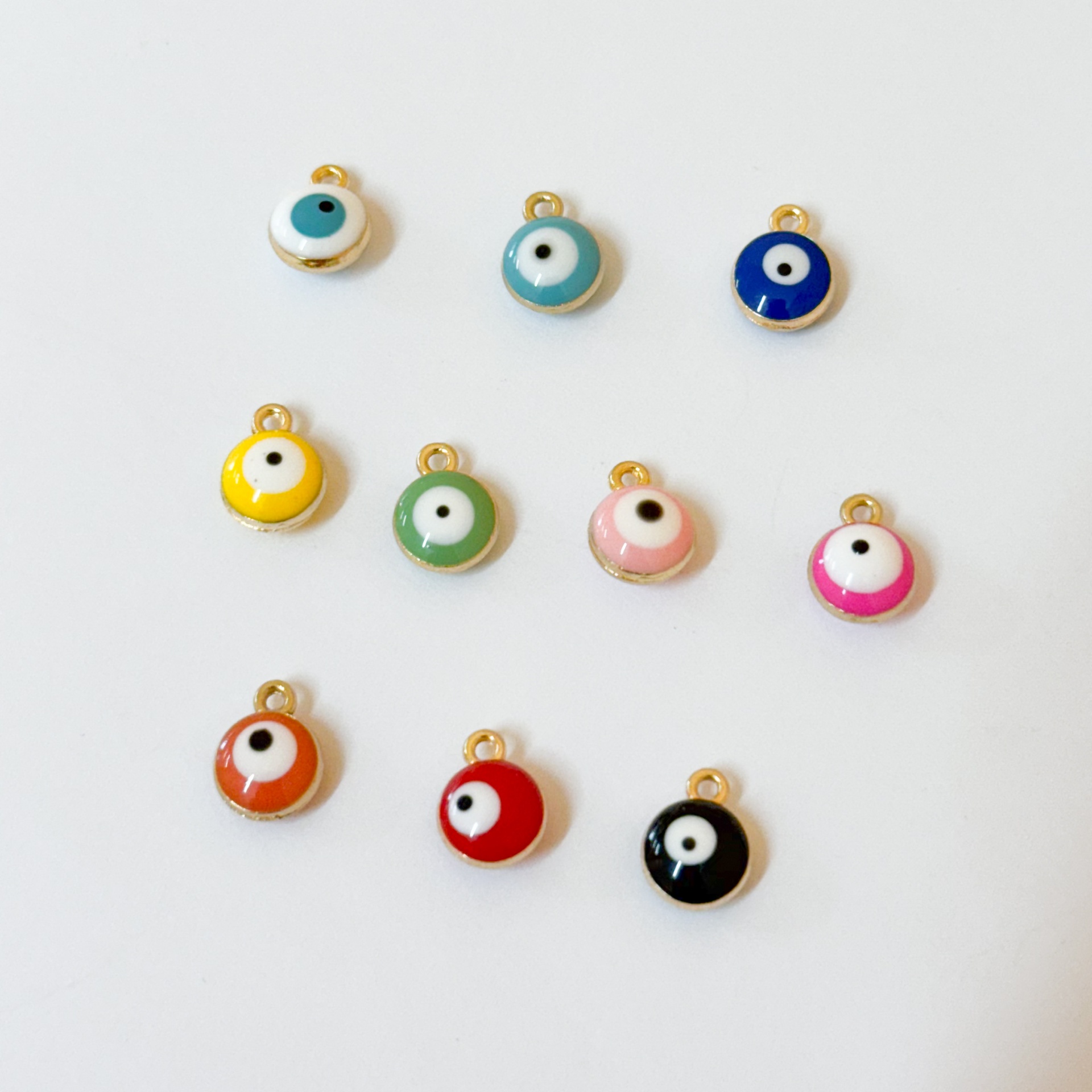 Pendente Colorido Olho da Sorte 0,50 € Desconto de %. Partilhar Cor Branco Turquesa Azul Amarelo Verde Rosa Claro Rosa Choque Laranja Vermelho Preto Comprar Contactar Material: metal e esmalte Dimensão: 9mm x 6mm