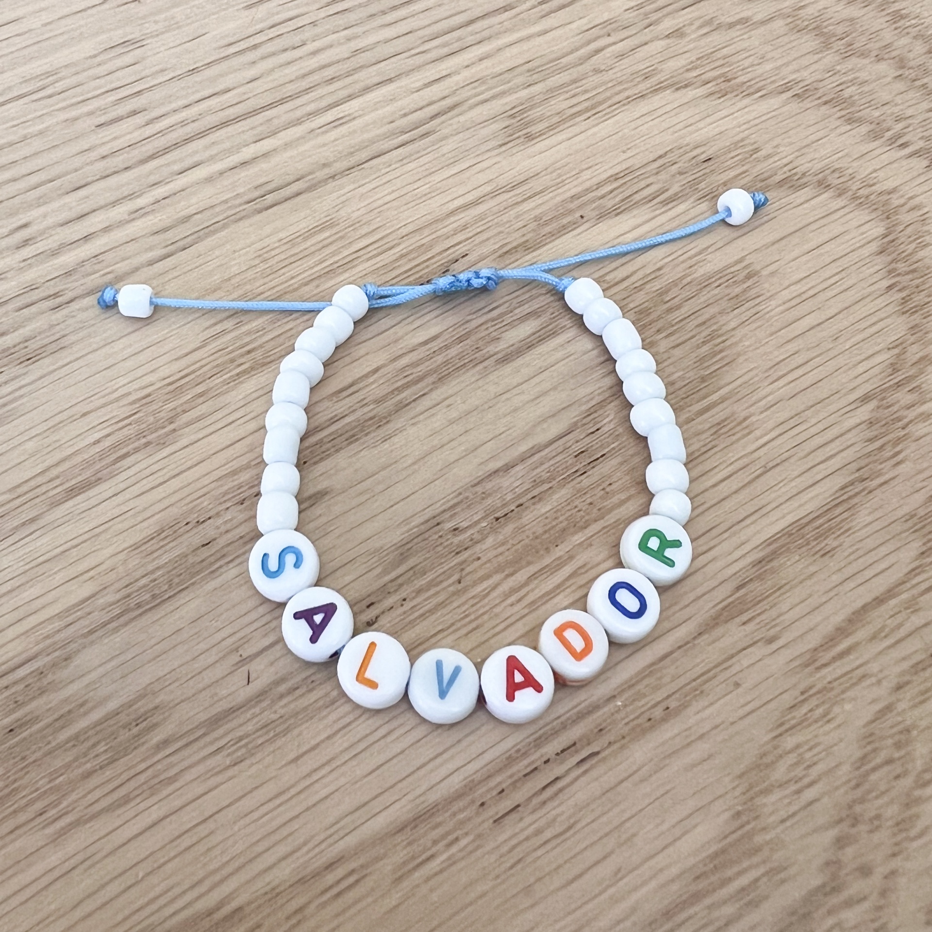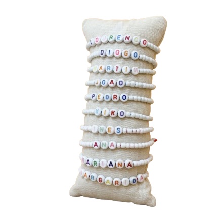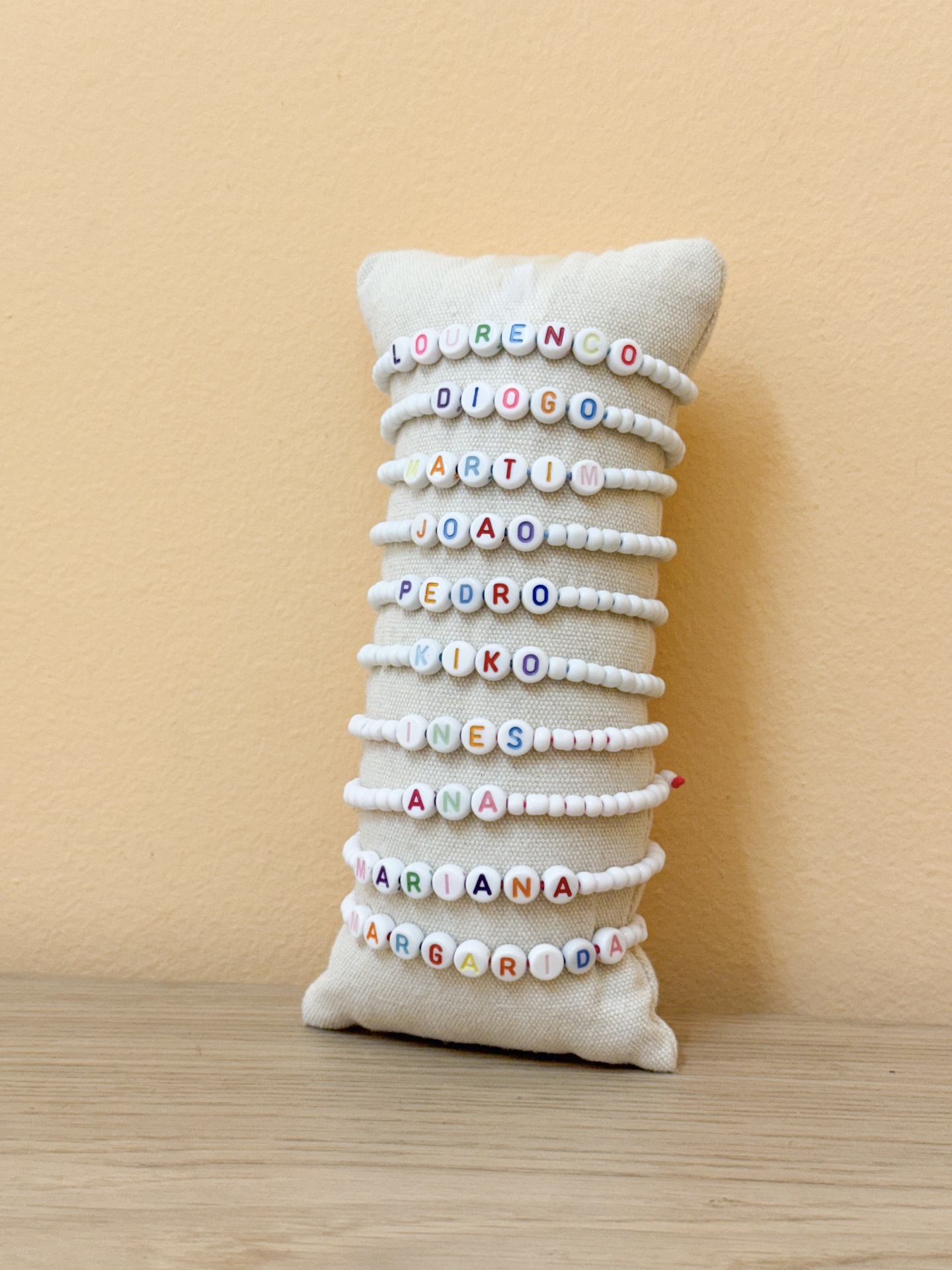 Pulseira Nome e Missangas 5,00 € Desconto de %. Partilhar Nome Martim Joao Kiko Ines Ana Comprar Contactar Pulseira regulável em missangas de vidro e letras de acrílico. Serve desde cirança a adulto.