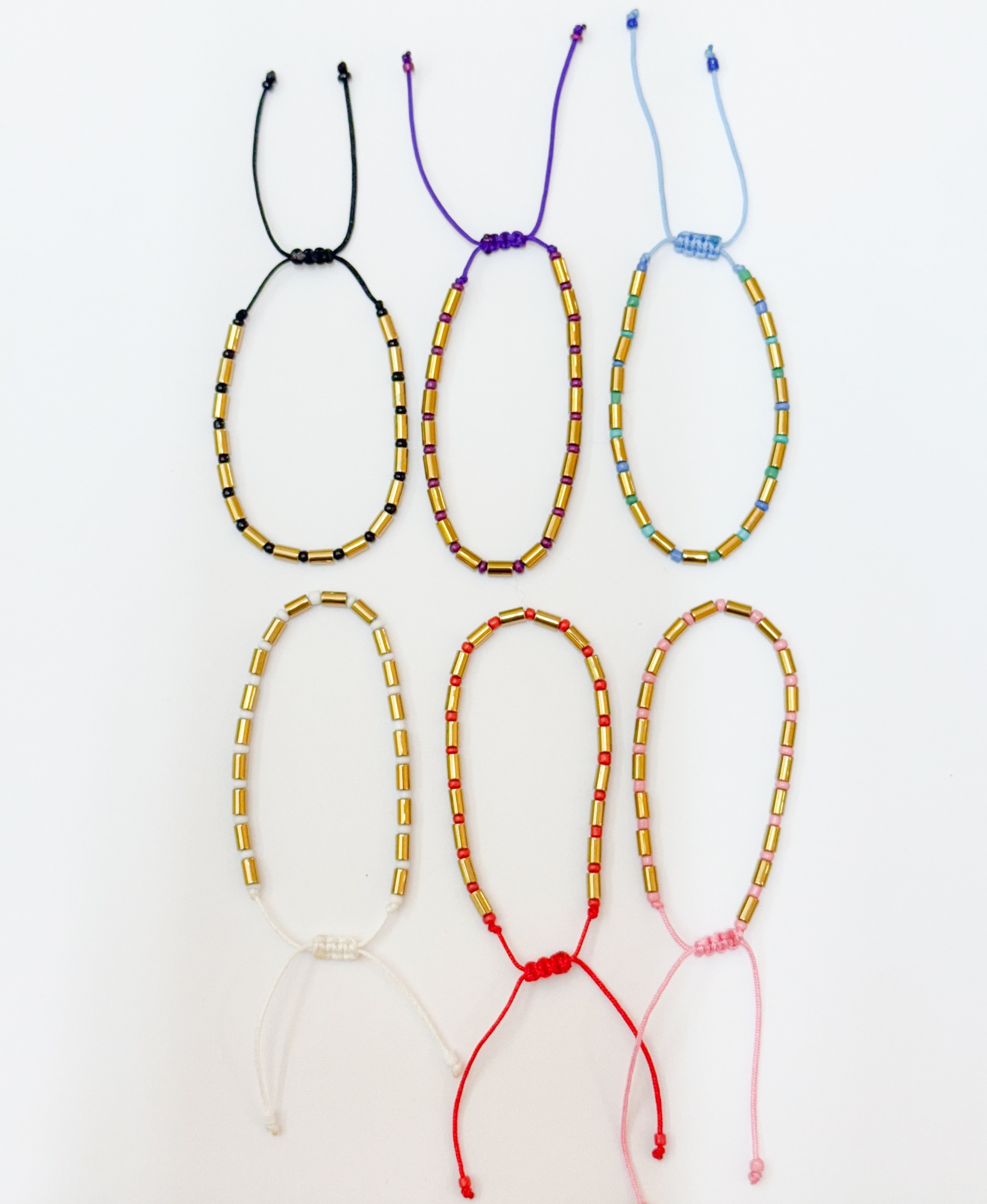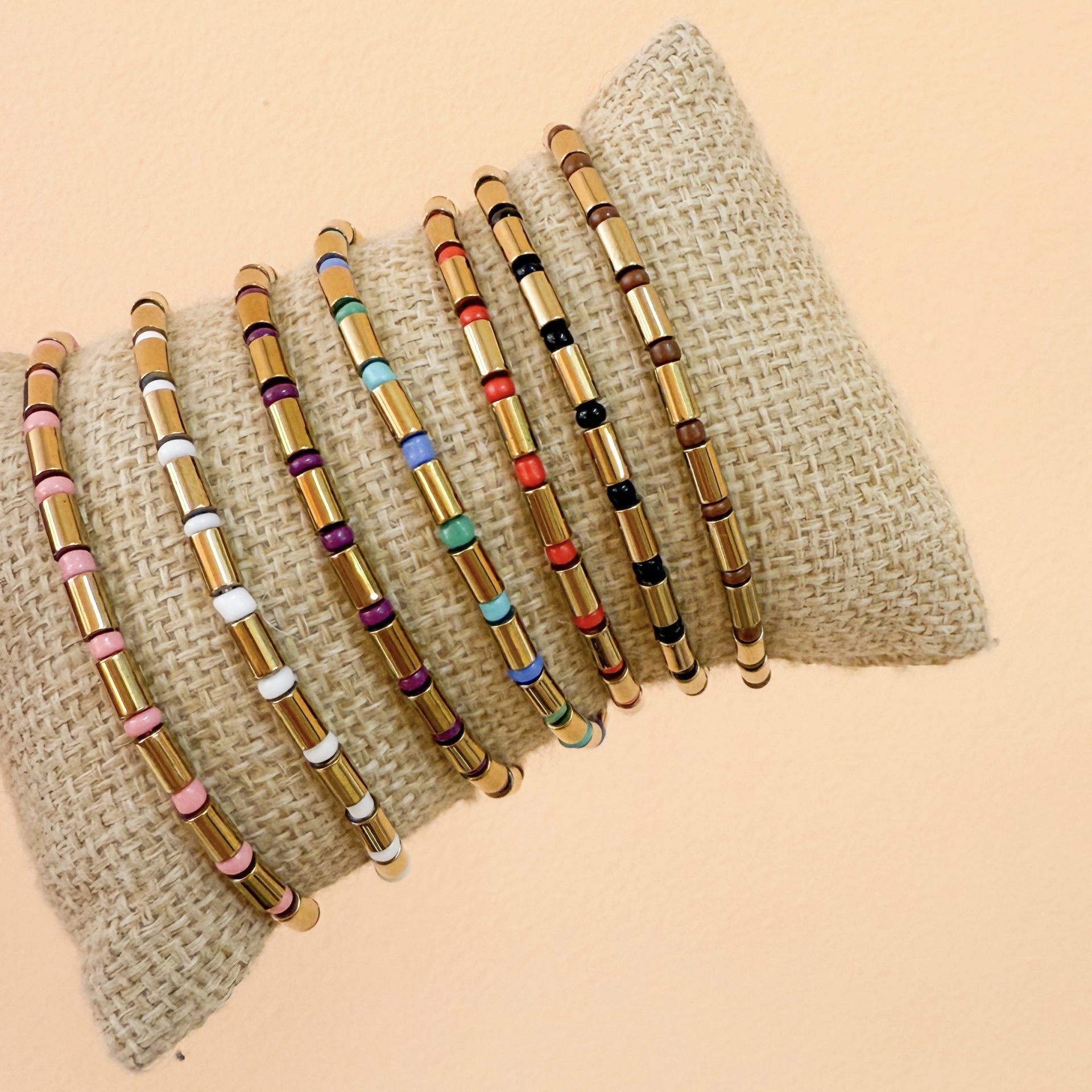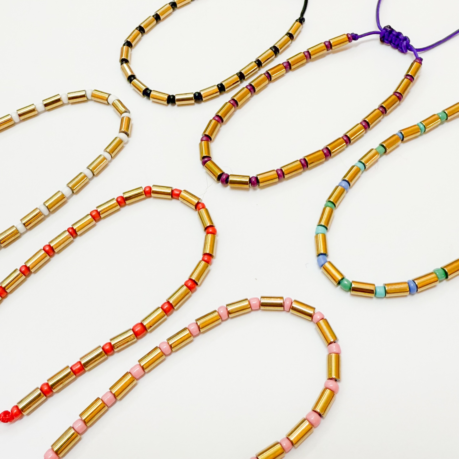Pulseira Tubos e Missangas 6,00 € Desconto de %. Partilhar Cor Rosa Branco Roxo Azuis Vermelho Preto Comprar Contactar Material: hematite e vidro Tamanho regulável ao pulso